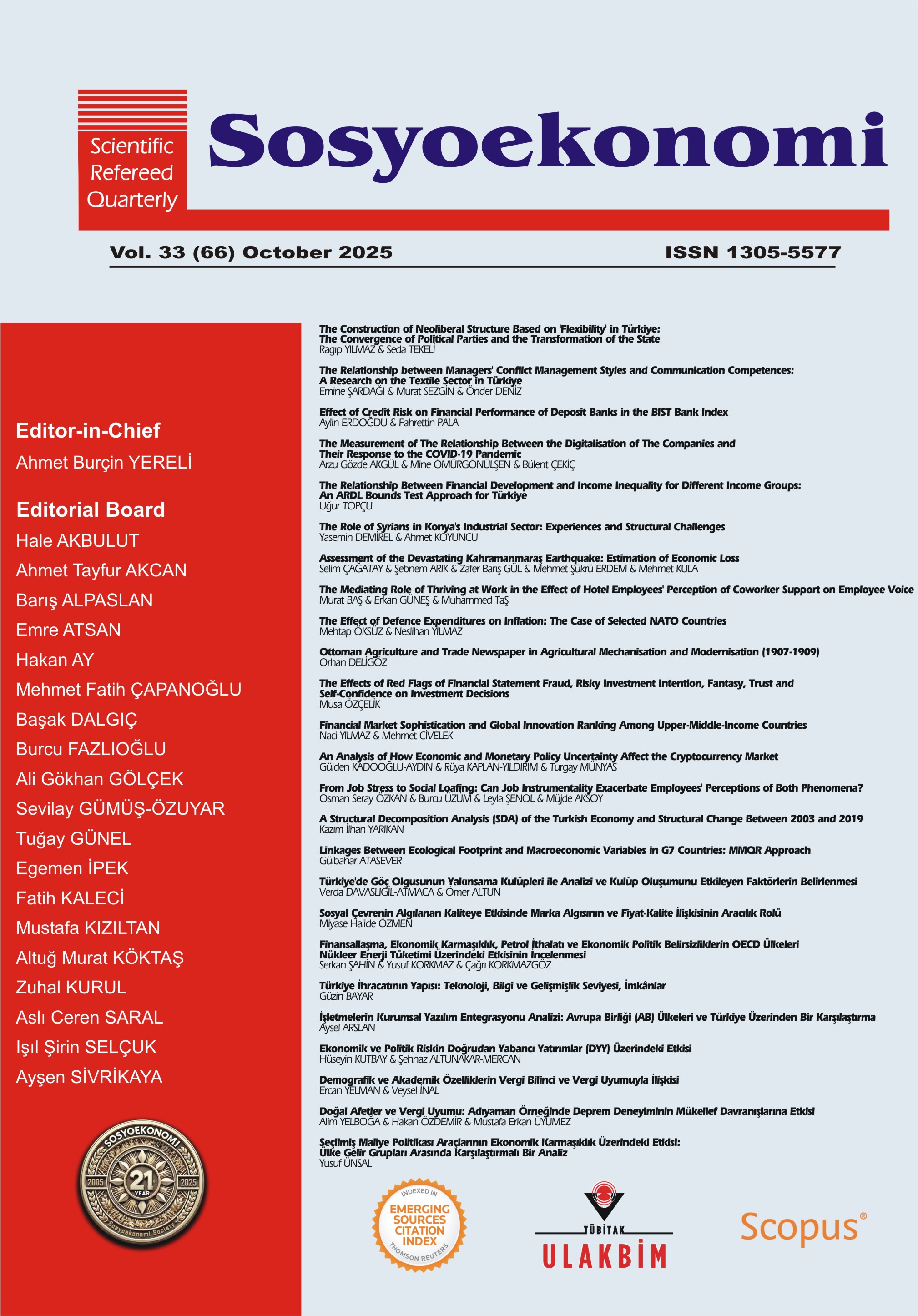 Sosyoekonomi is committed to promoting debates in economics but not only designed for studies and research on socioeconomic issues, but also on public economics and public finance, political economy, business economics, labour economics, law and economics, economic sociology, economic history and also has been published as hard copies and via the internet.